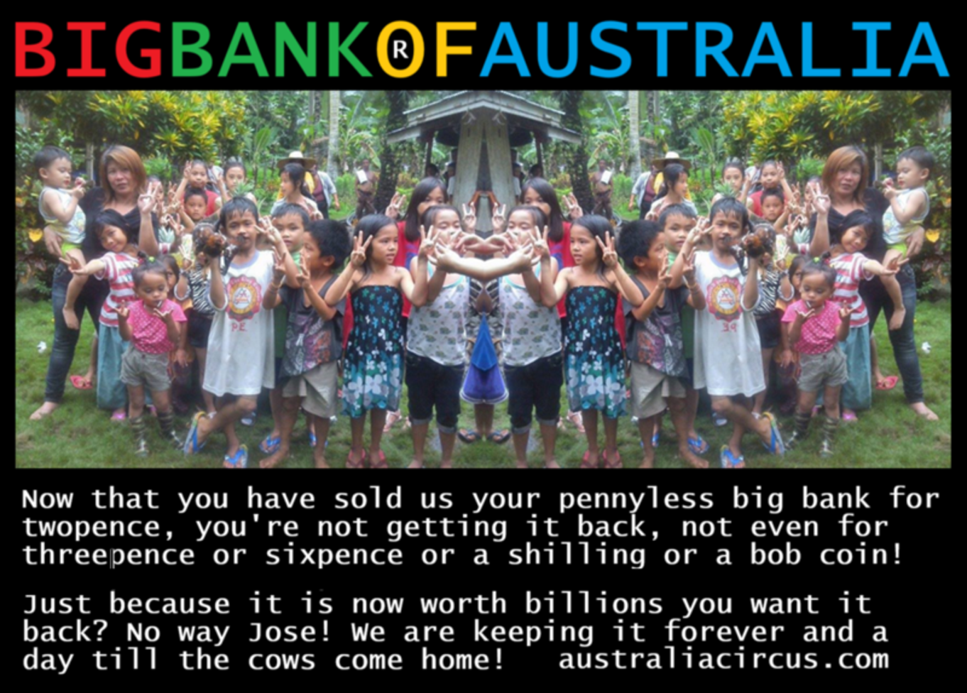 For anyone who thinks the BIG BANK OF AUSTRALIA is not fair dinkum, it is a registered trademark in Australia, as is POLICE CIRCUS, WISHING and QUEENSLAND